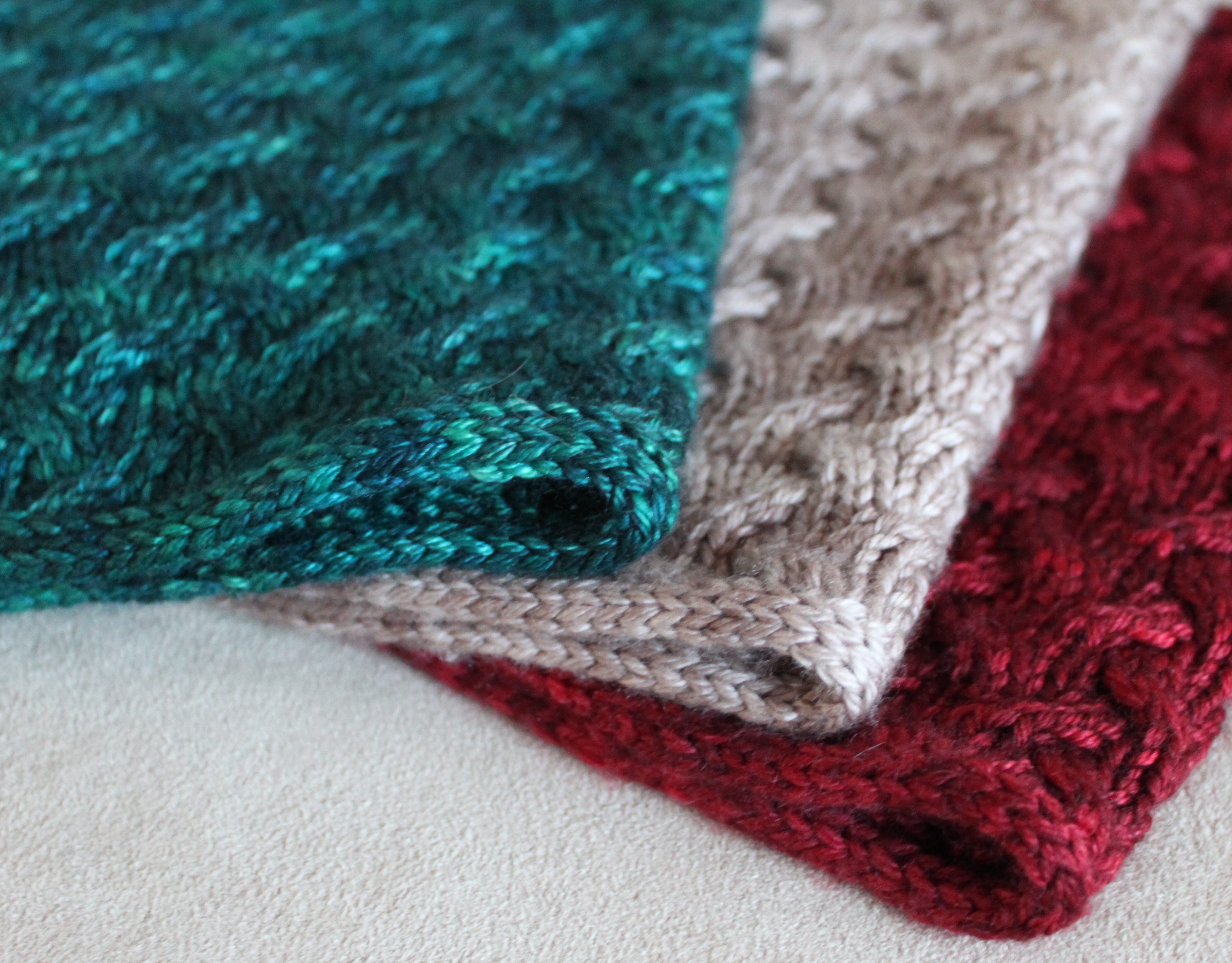 As always, it’s the yarn that makes each of my patterns. This time I used Madelinetosh Pashmina Worsted. It is a wool, silk, and cashmere blend which is critical to comfort for anything worn around the neck, right? The colours shown in the photos above are Tart, Antique Lace (my favourite!), and Cousteau.