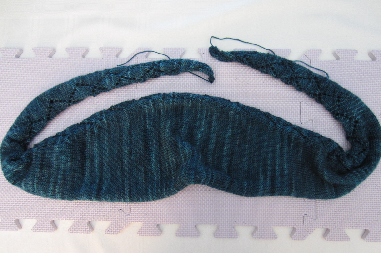 Here is a ‘before’ photo of my Zigzag Diamond Shawl, fresh off the needles: