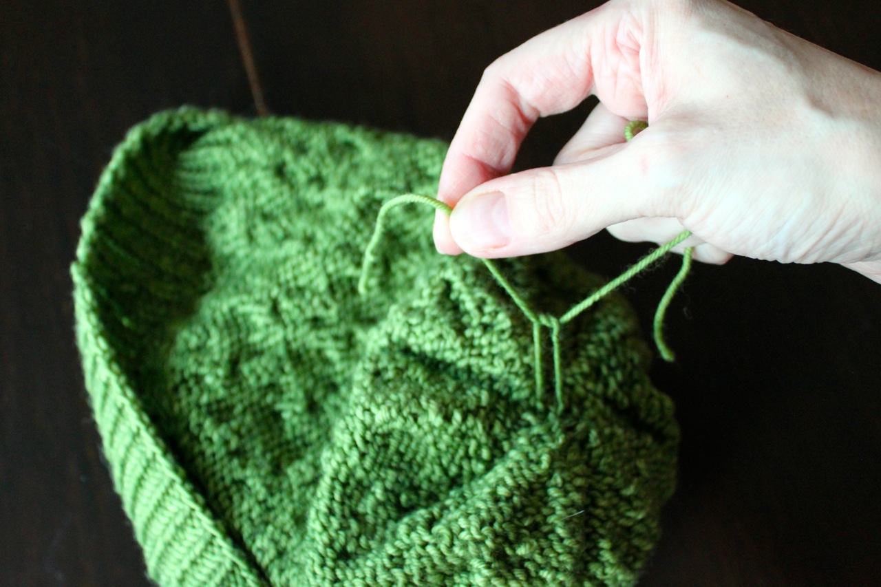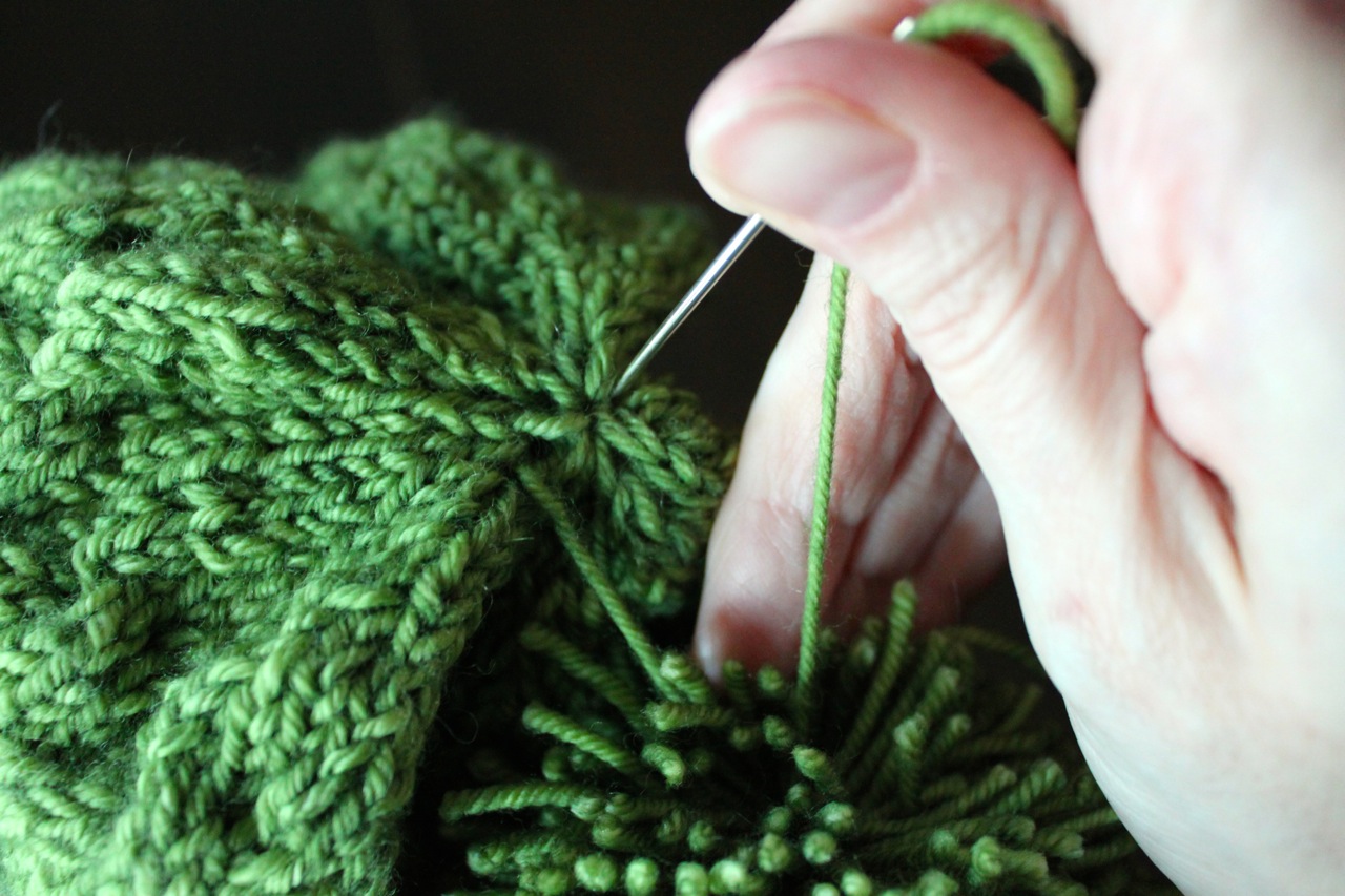 Attach the pom pom by threading the long pieces of yarn through the top of the hat with a tapestry needle.