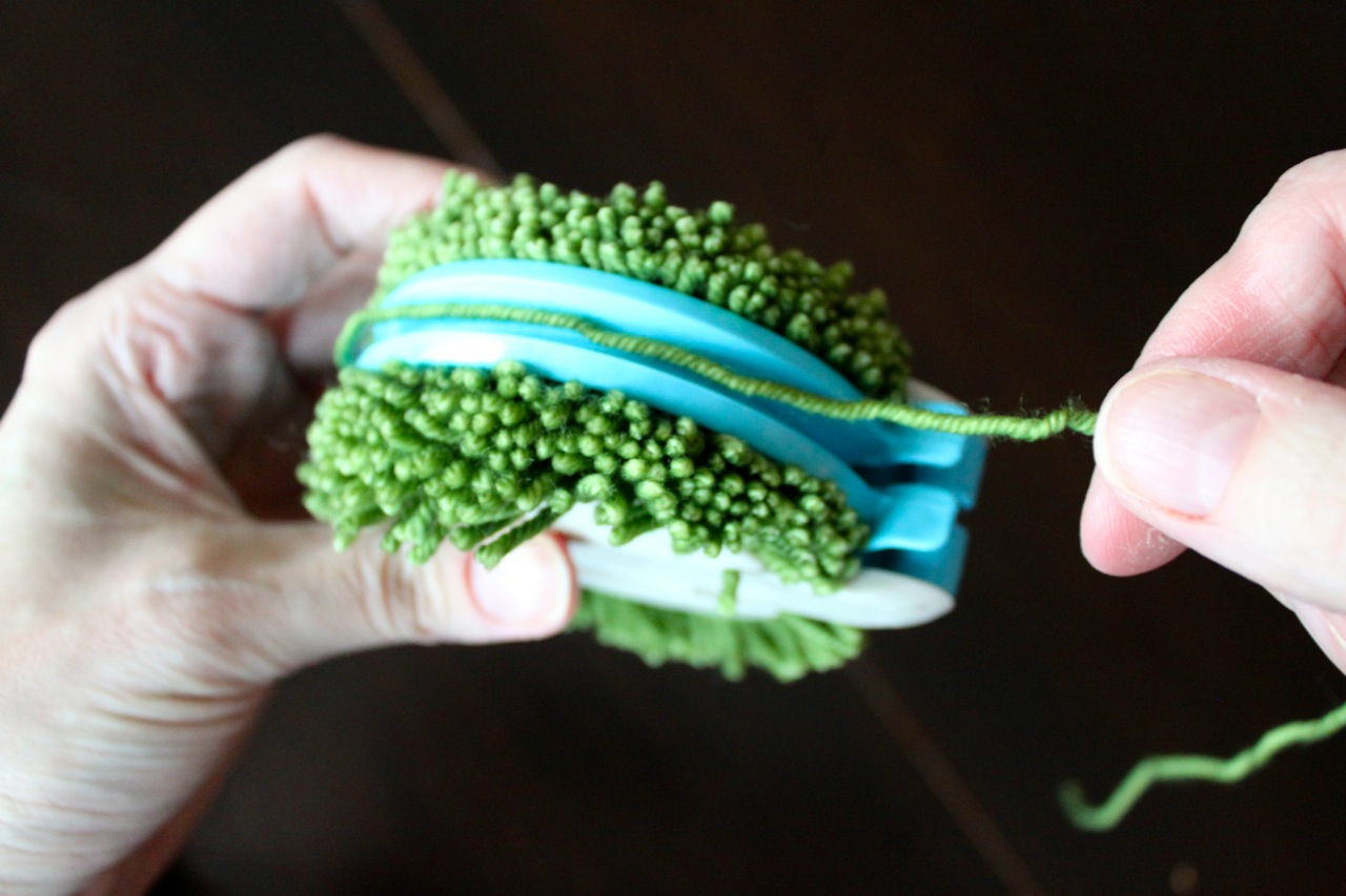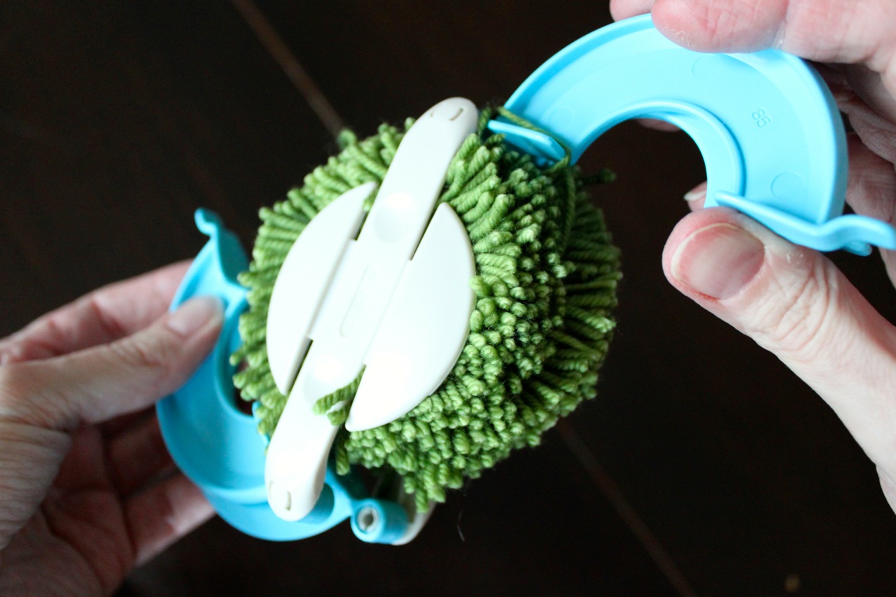 It is very important to tie tightly, otherwise you will end up with a thousand pieces of yarn scattered in your lap. Ask me how I know! Here is my secret to getting it really tight. Use at your own risk! I wiggle the two sides of the pom-pom maker just slightly apart so that the yarn can get right down there into the middle. Don’t pull them all the way apart!
