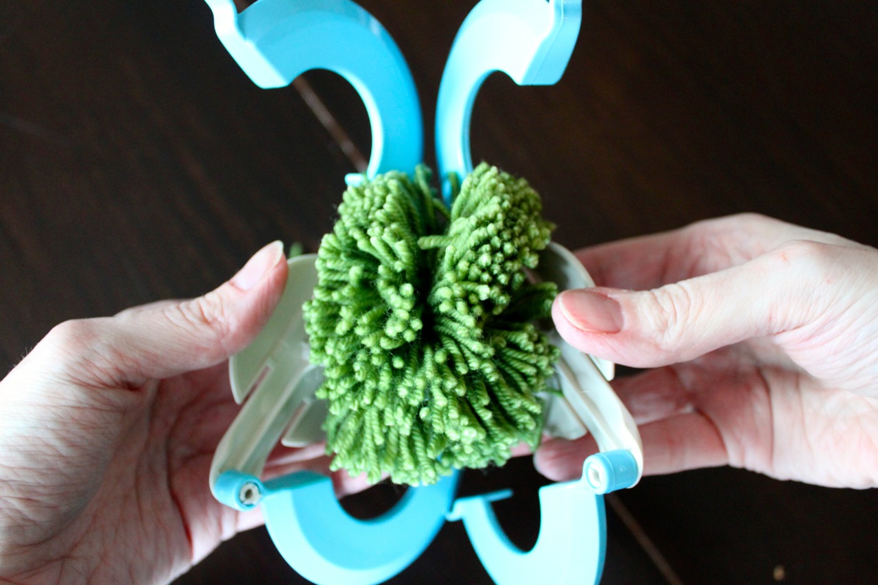 When the yarn is all wound, close the arms of the pom-pom maker.