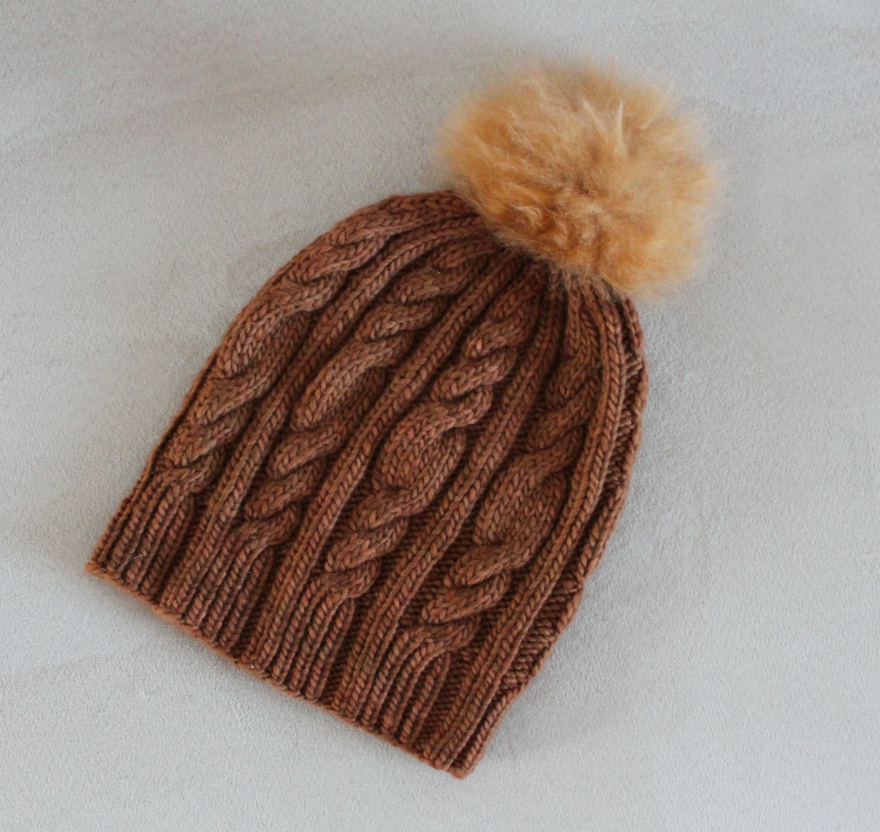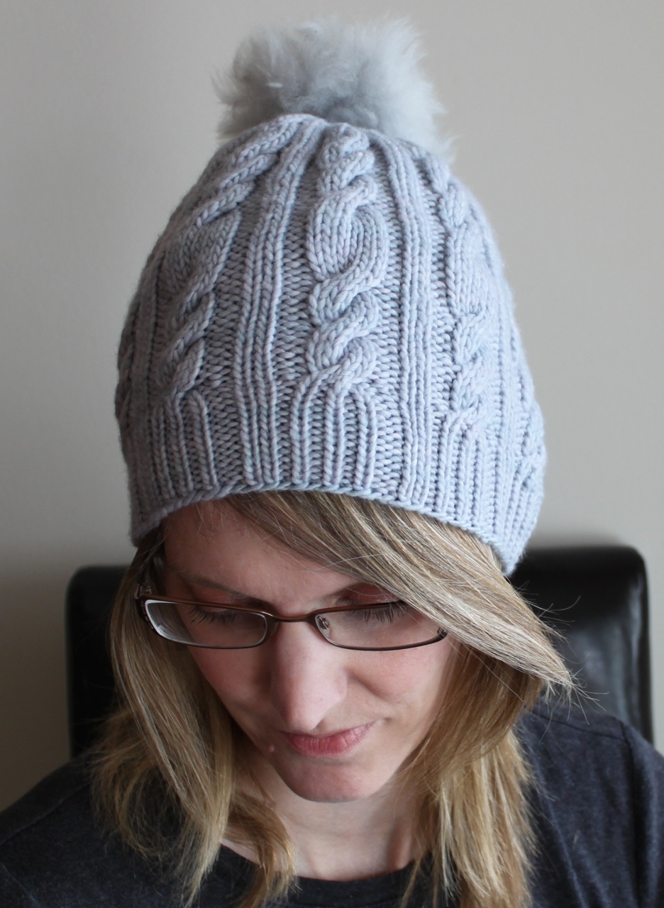 Before the seasons change, I have one last hat pattern. It’s the Bestie Slouchy and it’s a slouchy, relaxed version of the Bestie Beanie. The ribbed brim is worked for 2 inches before left and right lifted purl increases are used to enlarge the body of the hat. The Bestie Beanie cable and rib pattern is worked until the crown which is decreased to the top. Add any type of pom-pom, or not. These ones are alpaca fur pom-poms from Toft. I bought mine at LoveKnitting.com.
