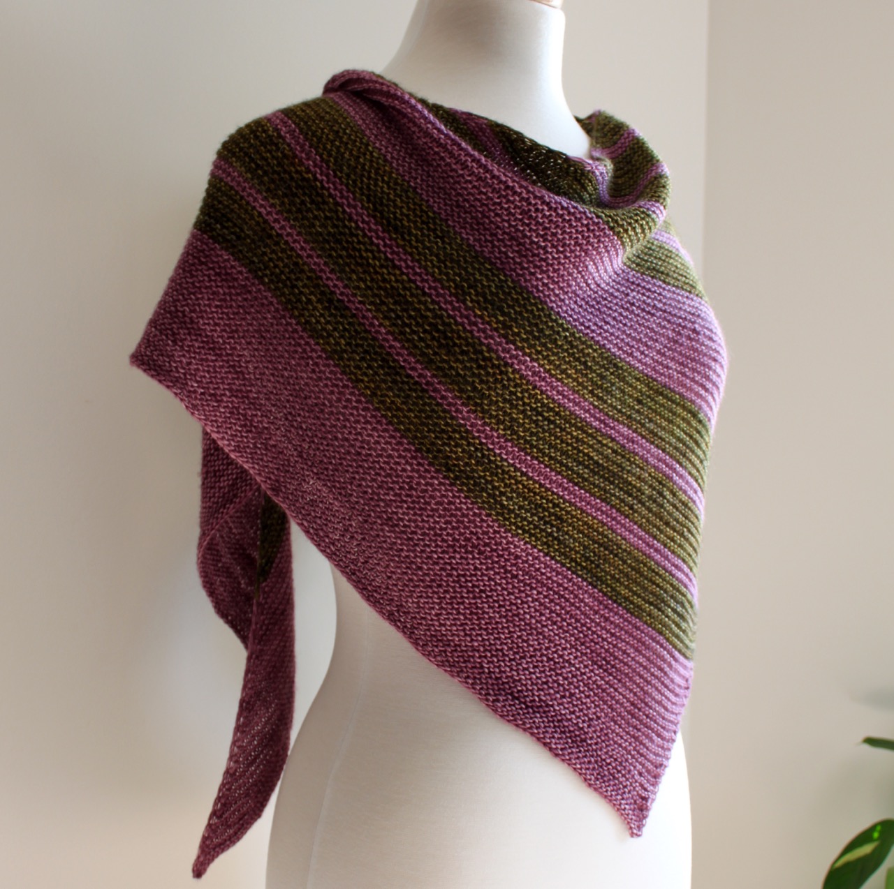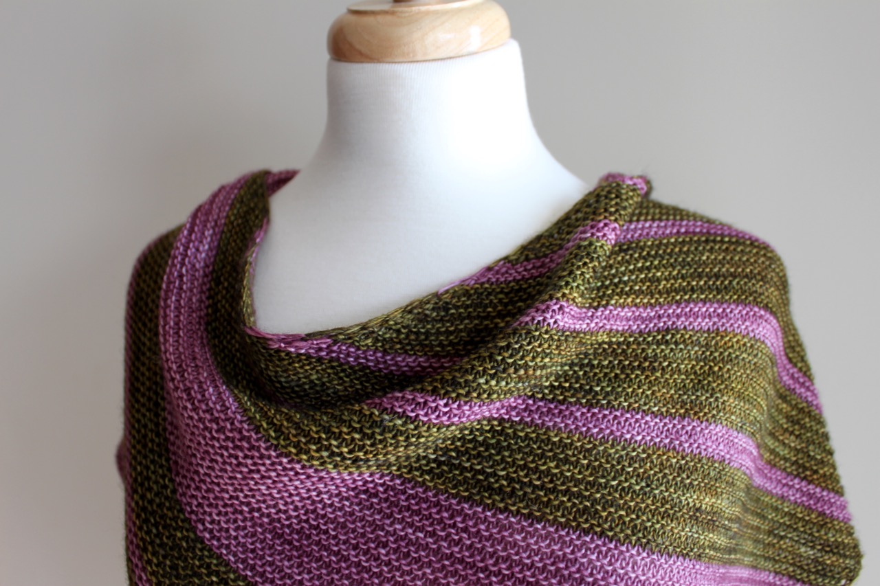 8 Simple Stripes is a sideways asymmetrical, or bias, shawl that is worked from one corner point to the opposite edge. Easy increase (kfb) and decrease (k2tog) stitches are alternated to create a soft triangular shape. The interesting stripe pattern keeps the knitting from ever getting boring!