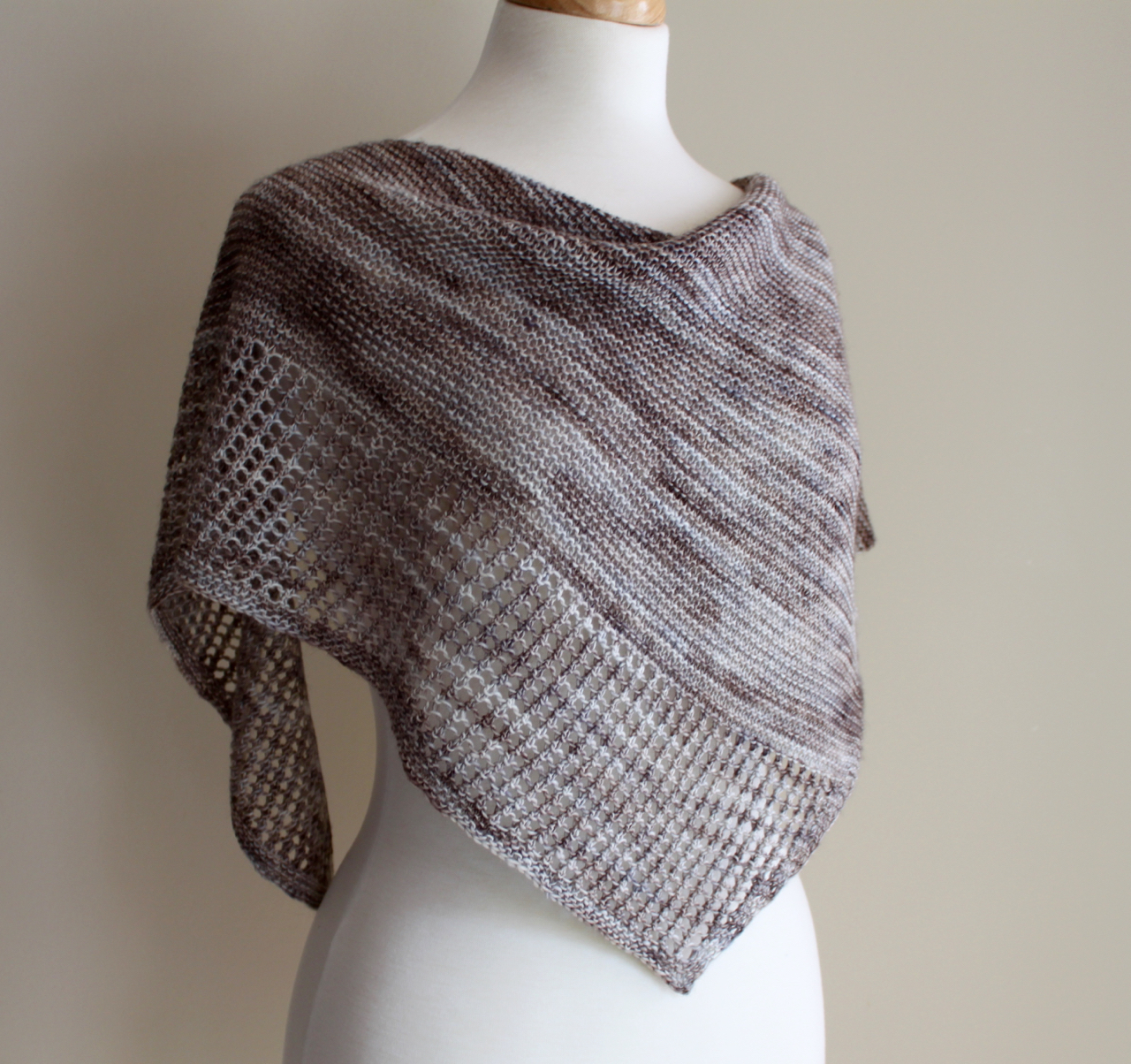 This shawl is designed in Madelinetosh Tosh Merino Light and is shown here in Whiskers. Choose a tonal, variegated, or any hand-dyed fingering weight yarn and the garter and eyelet stitches will show off the colour beautifully.