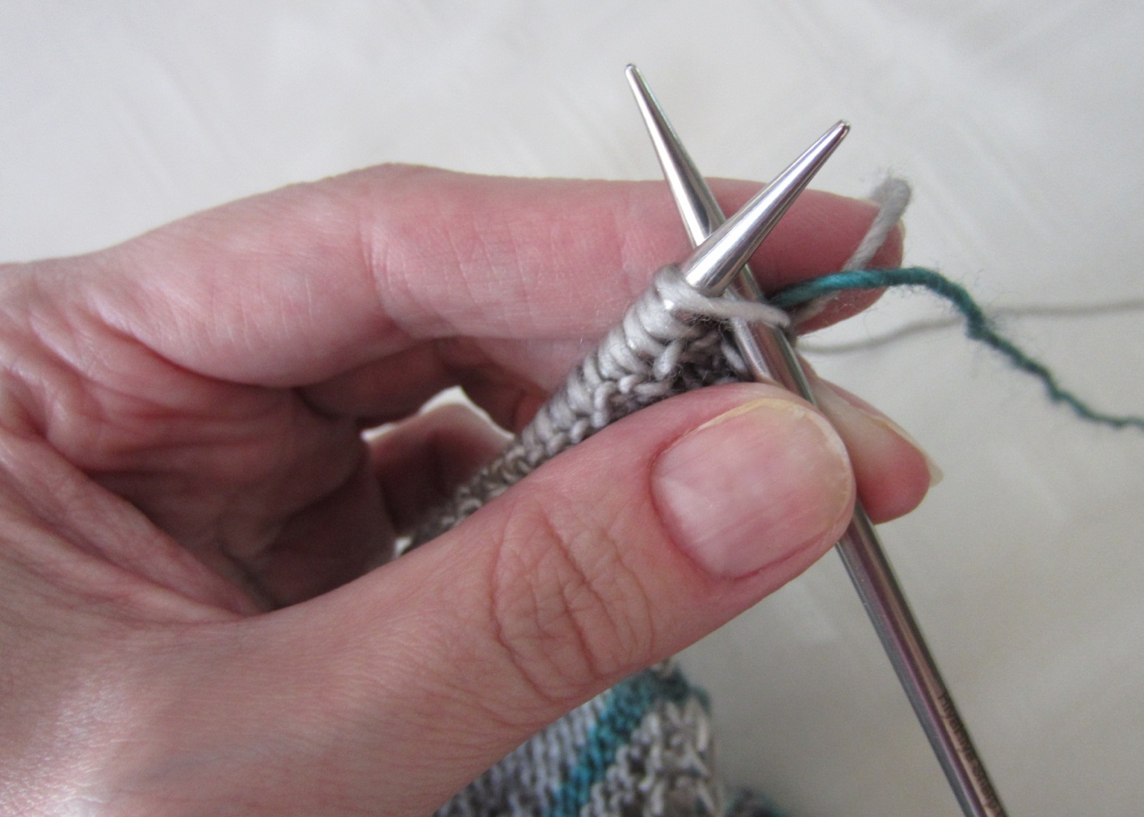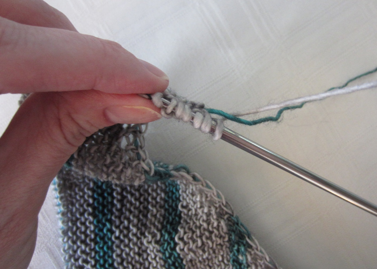 My 8 Simple Stripes shawl pattern uses two colours. There is the main colour and then a second colour for the stripes. This is a great pattern to learn about changing colours. With these stripes, the colour always changes at the edge of the knitting, the easiest place to change colours. Choosing the two colours is the fun part. But when you get to the first colour change what do you do with your yarns? To change colours, you simply drop the colour you were using and pick up the new colour at the beginning of the correct row. It’s just like starting a new ball of yarn.